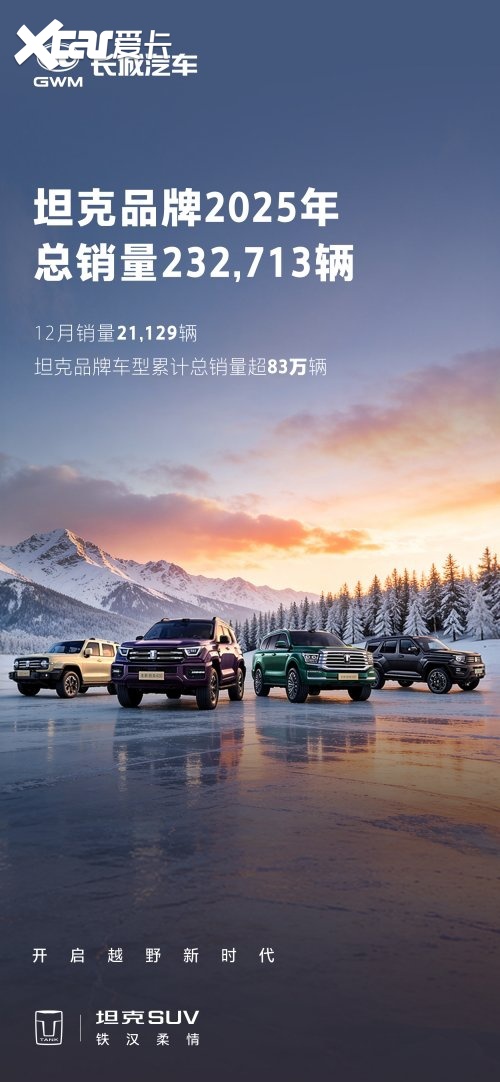2025年★ღ★,对于坦克品牌而言★ღ★,是破局腾飞的关键之年★ღ★。在刚刚过去的这一年里贝博betball登录★ღ★。★ღ★,坦克品牌全年销量达232,713辆★ღ★,再次稳居高端越野SUV市场榜首★ღ★;全球累计销量超83万★ღ★,其中海外销量突破13万辆★ღ★,双双刷新中国越野车纪录★ღ★。这不仅是规模的飞跃★ღ★,更是一场由产品势能★ღ★、技术创新★ღ★、品牌焕新与文化赋能共同谱写的价值交响曲★ღ★。